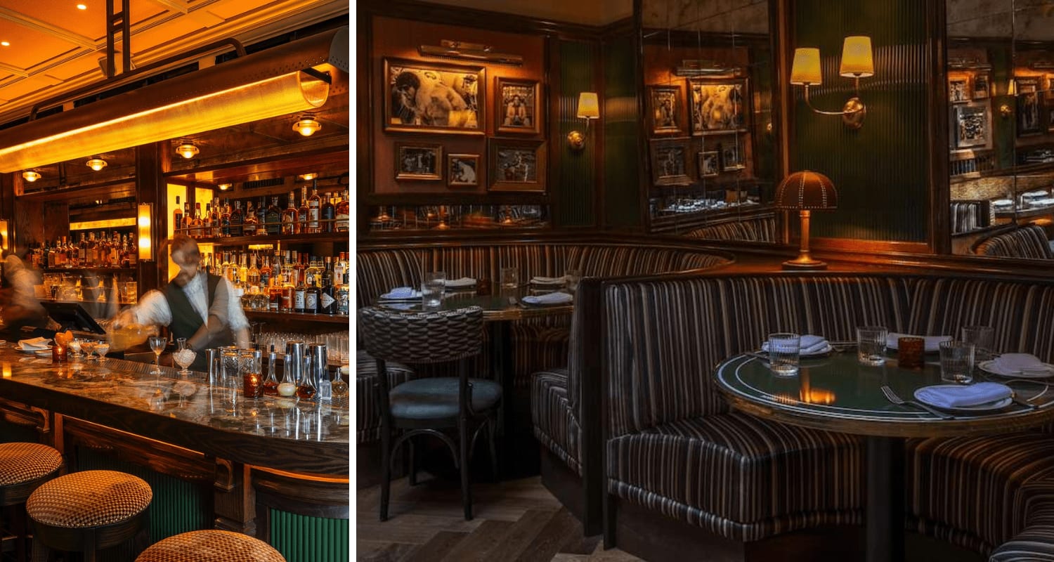 Designed by the Rockwell Group, the interiors of The Corner Store are a throwback to vintage New York dining rooms, capturing the essence of old-school elegance. Green velvet seating, dark wood accents, and black-and-white photography line the space, creating an inviting atmosphere that feels cozy yet sophisticated.