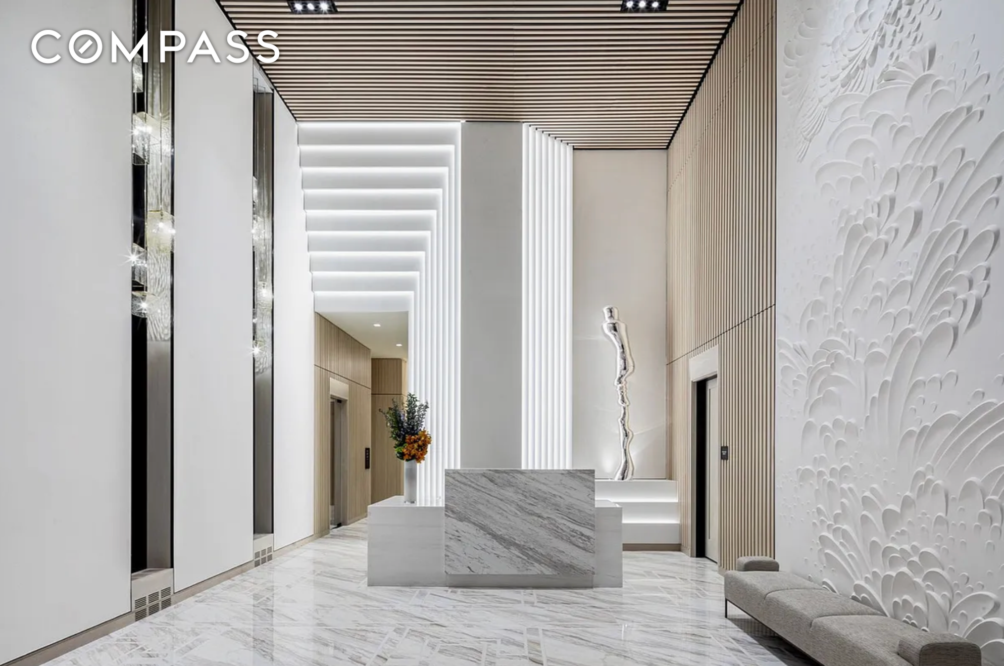 The serene primary suite offers a world class view of the Chrysler Building. Bedroom features an expansive walk-in closet, five-fixture en-suite bathroom with a deep soaking tub for relaxation, stately shower, European toilet, heated floors and sophisticated marble finishes. Second bedroom is generously sized, with inspirational NYC views and a zen en-suite bathroom. Home is complete with a striking powder room, Nest thermostat and Bosch washer/dryer.