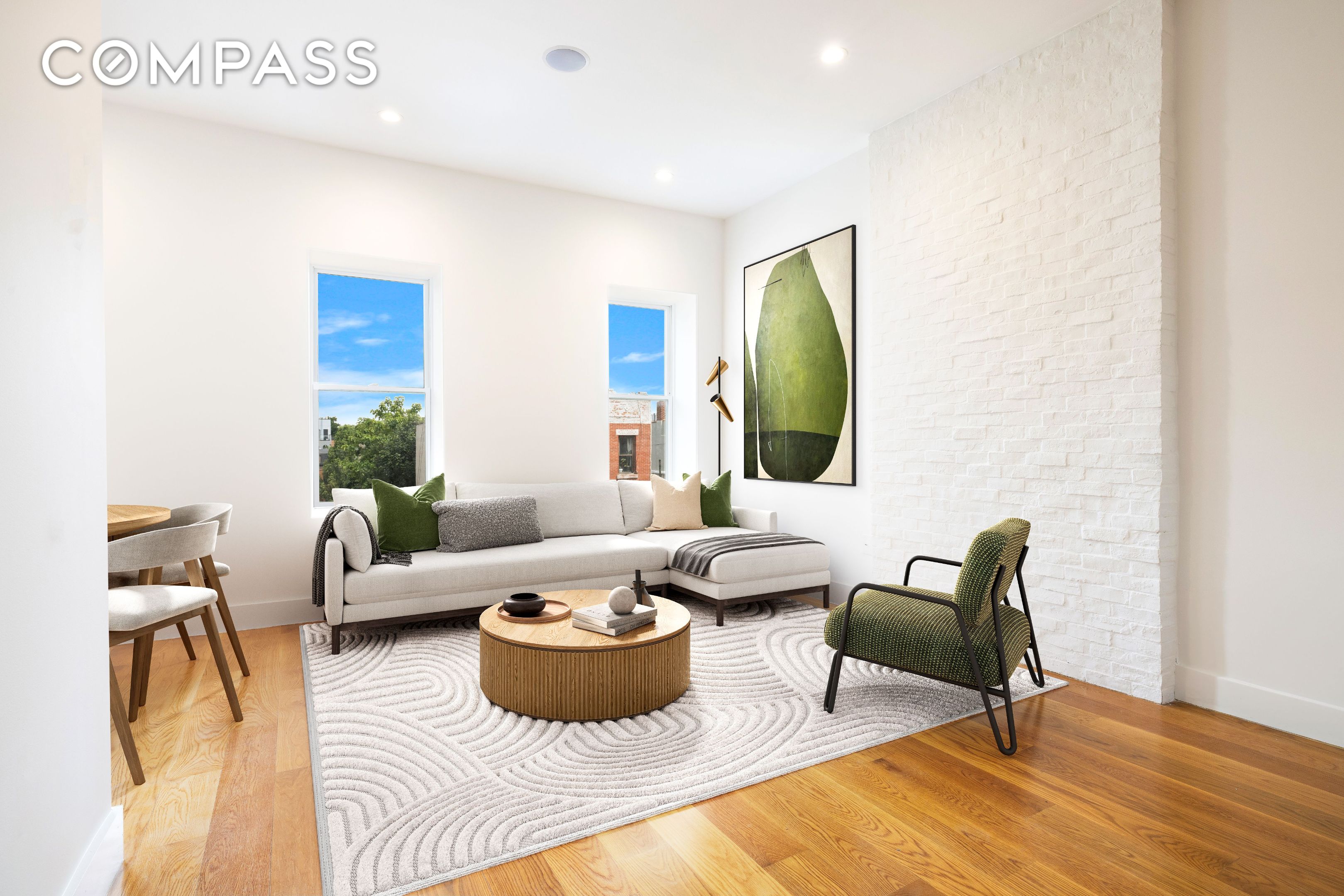 Apartment 4 at 140 Jefferson Avenue is a 1,030 square foot gem featuring two bedrooms and two full bathrooms. Upon entering, you'll be dazzled by the sprawling, bright living area accented with white brick and a windowed dining alcove. With large windows offering treetop views, this property brings the lush outdoors inside. The kitchen boasts a massive island with abundant built-in storage, electrical outlets, and elegant White Macaubas Polished European granite countertops. It is equipped with a 5-burner Bosch gas range, Bosch dishwasher, wide Miele refrigerator, and a farmhouse sink. The units boast sleek six-inch wide plank White Oak floors, quiet split system heating and cooling, soaring 9'+ ceilings, Bluetooth sound systems with speakers in every room, and in-unit Samsung washers and dryers.