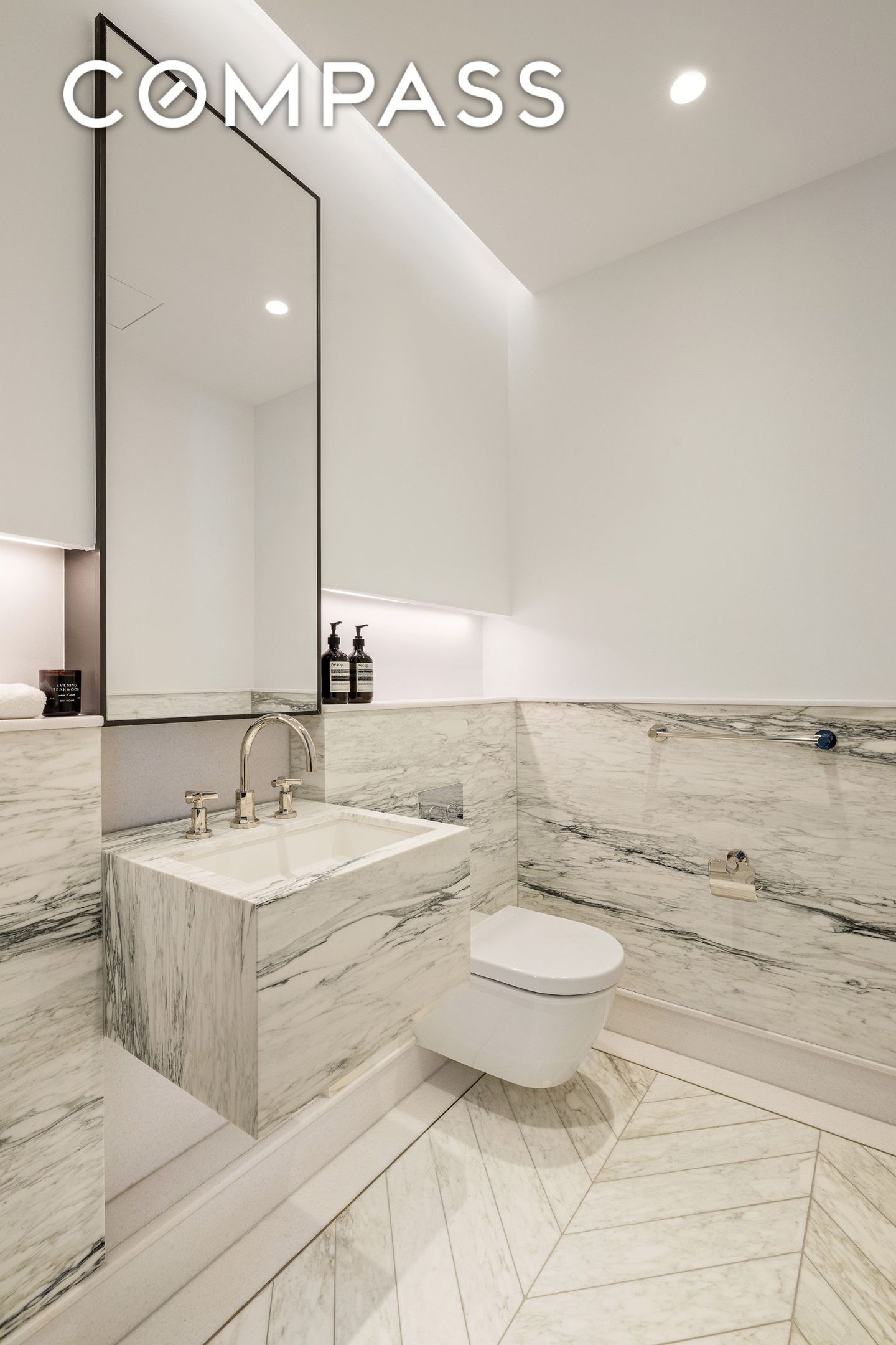 A Calacatta marble powder room, abundant custom storage, stacked washer and dryer, and a fully integrated Kraus Hi-Tech home automation system thoughtfully complete the residence.