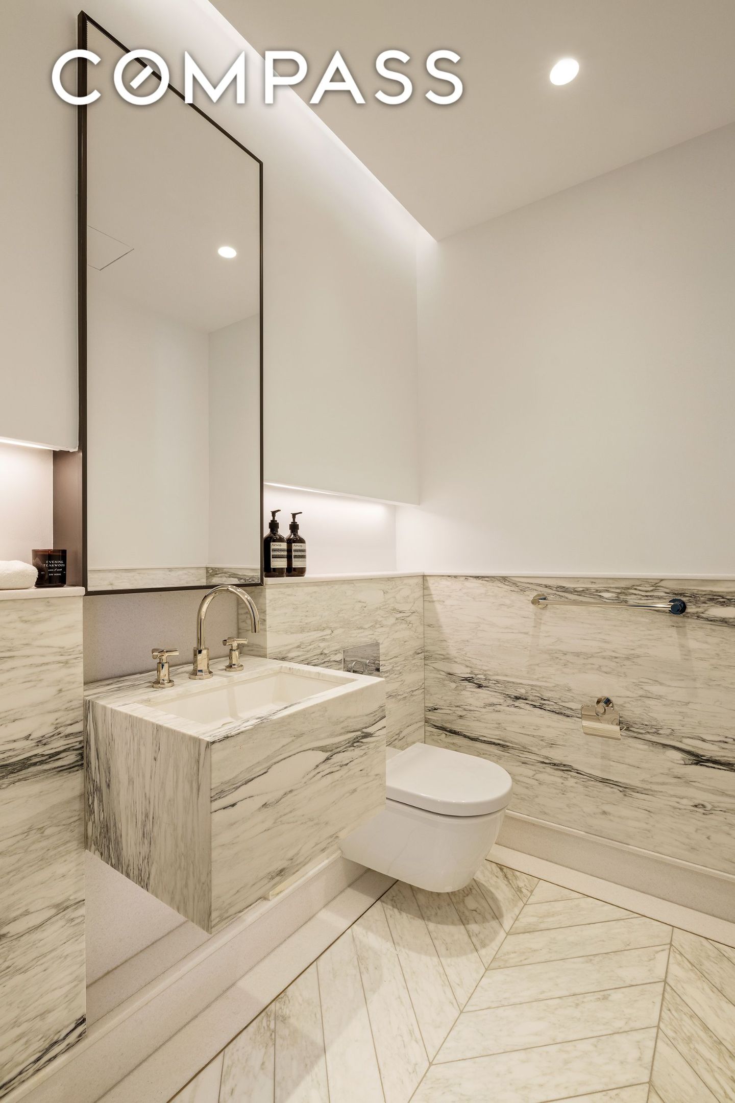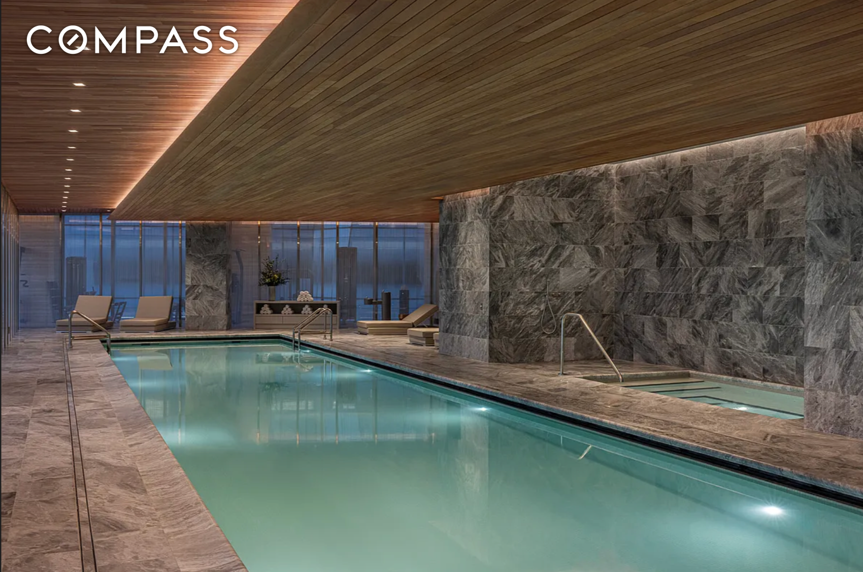 The secondary bedroom is bright and generously proportioned, offering a refined retreat with its own en-suite bath. Chevron-patterned Arabescato Vagli Oro marble floors, Statuario accents, radiant heat, and Crystal White stone walls create a serene, spa-like setting.