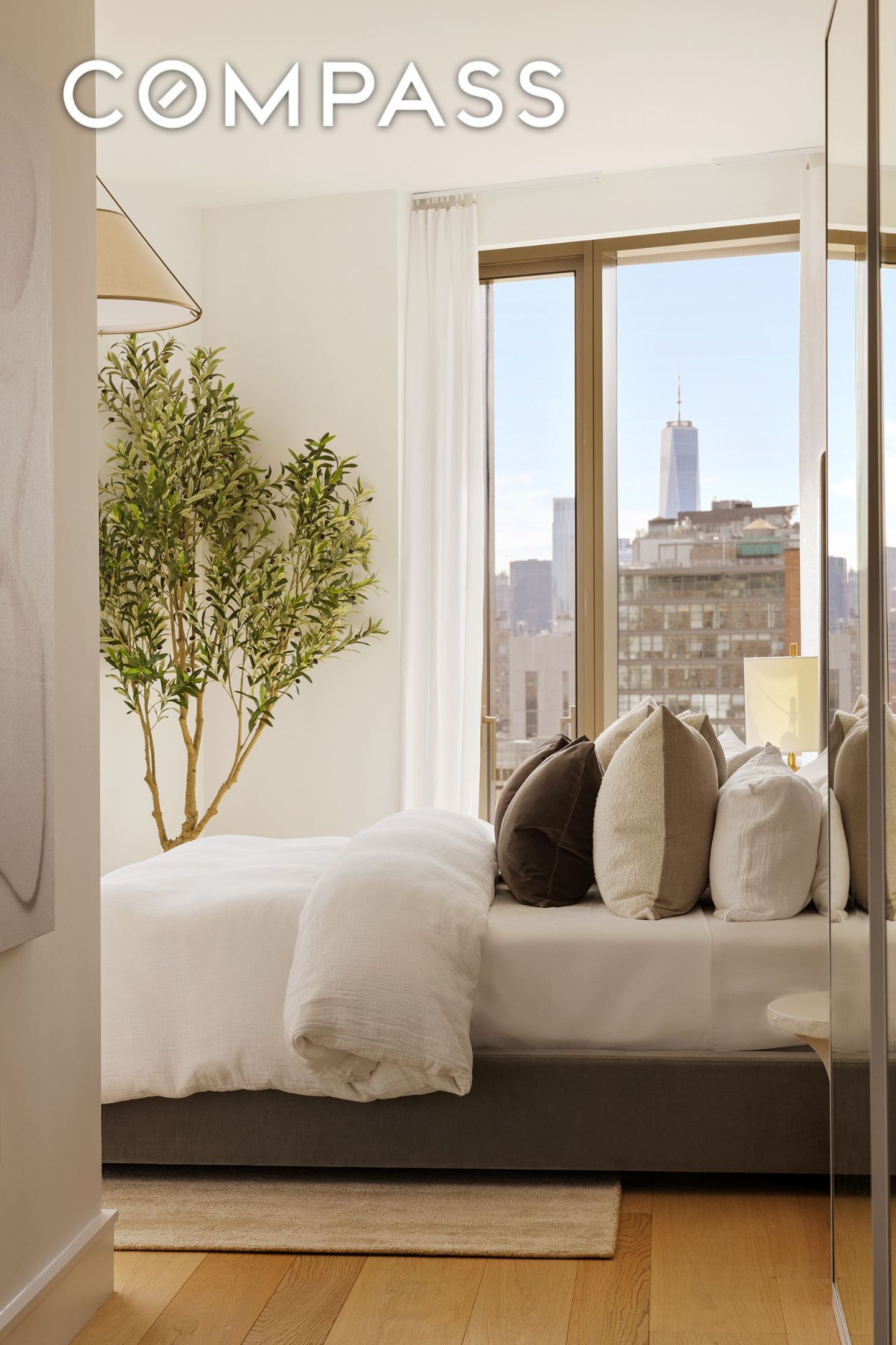 The primary suite is defined by its expansive views of the NYC skyline. There is generous storage, including a substantial walk-in closet. The statement bathroom features a luxurious soaking tub with majestic Manhattan views and appointed with Arabescato Vagli Oro and Saint Laurent marble. Radiant heated floors, glass-enclosed shower, and bespoke double vanity create a private wellness experience.